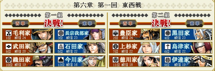 個人的には威信順よりは戦功の量で順位を決め、組み合わせを考えてほしかったという気持ちも若干はあります