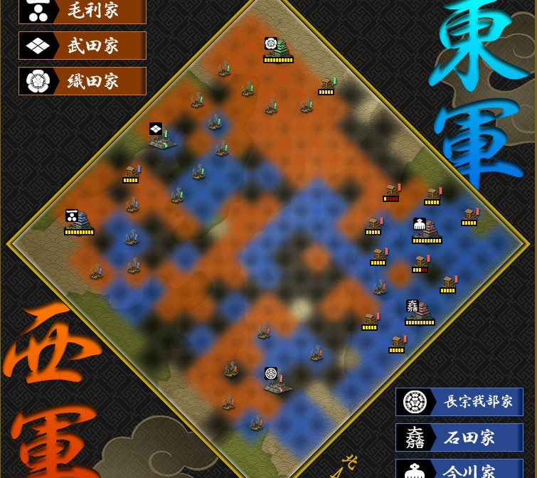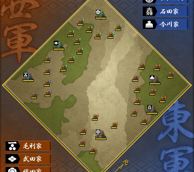 しかし、今回は東西戦です。3対3です。毛利家が長宗我部家を、織田家が今川家を速攻で落として、三国連携で石田家を攻略していく