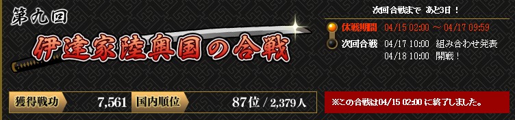 総合:524320(4位)☜合戦開始前の陣の数が1個だったことを考えれば素晴らしすぎる結果です