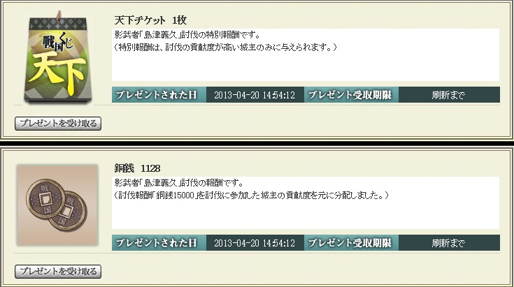 なので、報酬の代わりに、天下チケをもらえたことはよかったことだと思います