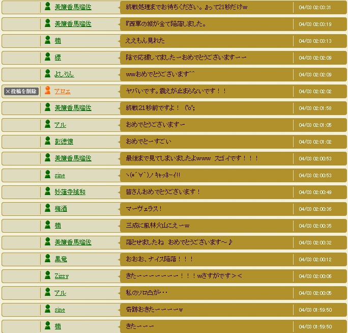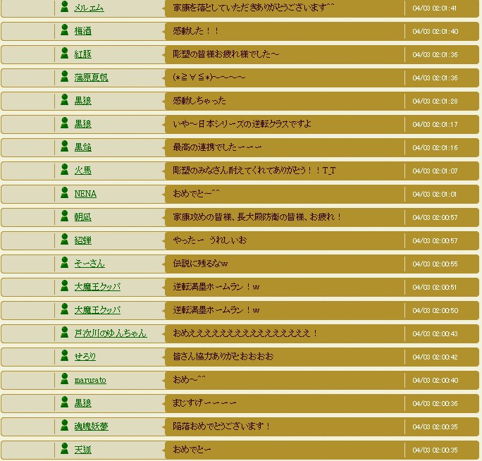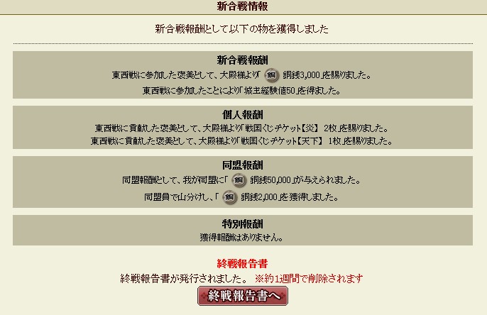 ということでいつもなら頭に貼っている合戦結果を貼ります
