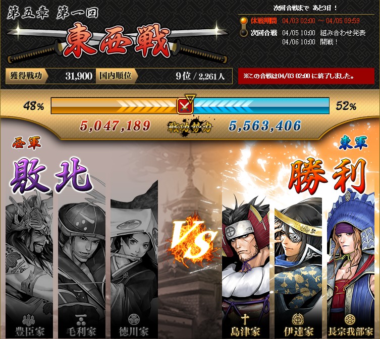 それでも1:30の更新では戦功差は14万差で我らが東軍がリードしていました