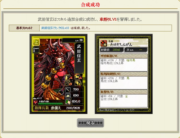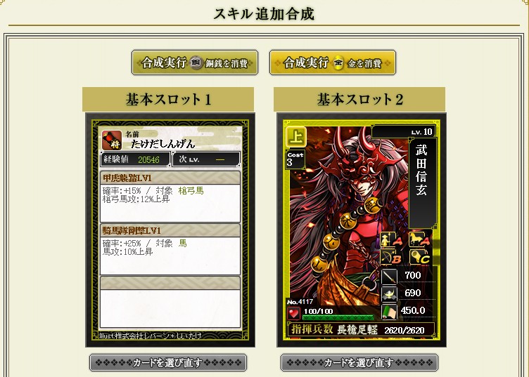 ちょっと前に配られた上の信玄さん。軍師に使おうと思って1枚だけ剛撃付けて放置していたのですが、同カード合成すると車懸りと剛勇無双が狙えたんですね