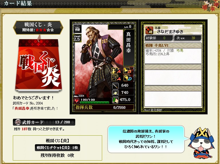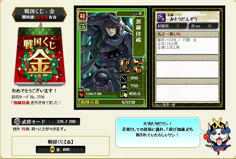 デッキコスト課金したのでついでと思い、排停武将ほしいなということで金クジちょこっと引いてみましたが・・・