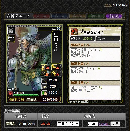ということで【上】武田晴信で騎馬隊挟撃を【極】黒田長政さんに付けようとしたところ